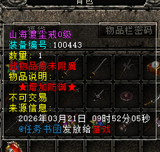第六个任务完成也会给惊喜哦,是本服的特色物品之二,会给予一个山海渡尘戒0级